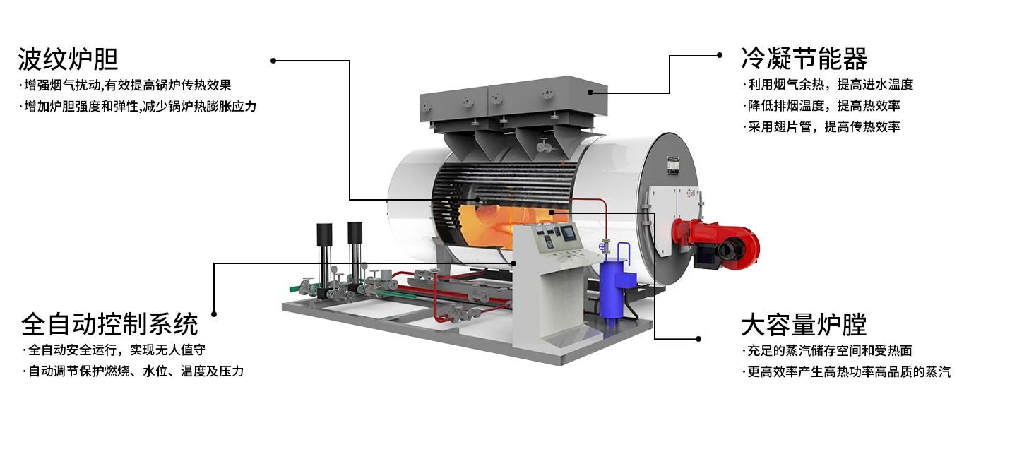 高效節(jié)能。節(jié)能器、冷凝器換熱面積大,煙氣中的水蒸汽冷凝率高,可充分吸收煙氣中水蒸汽冷凝釋放的熱量,熱效率可高達(dá)99%以上。采用螺紋煙管對(duì)流受熱面,有效提高鍋爐傳熱效率。